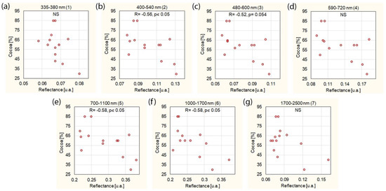 Correlation between cocoa content in chocolate and reflectance for different wavelength ranges: (a) 335–380 nm, (b) 400–540 nm, (c) 480–600 nm, (d) 590–720 nm, (e) 700–1000 nm, (f) 1000–1700 nm, (g) 1700–2500 nm. NS—not significant.