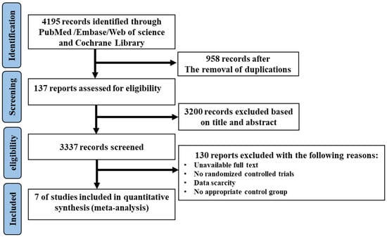 The complete flow diagram of the selected studies is shown in Figure 1. In brief, 4195 articles were found with the search strategy from four databases, where 958 duplications and 3200 irrelevant articles were removed based on the title and abstract. Then, 127 trials were included to be assessed for eligibility; of those, 130 studies were excluded as they were not randomized controlled trials, or due to the absence of an appropriate control group or full access to data. Finally, seven studies were included in this meta-analysis. Among the included studies, two articles were divided into two trials, in which, two diets with low MUFA content (coca butter and soybean oil) as the comparator, and two MUFA-rich foods (avocado and oleic acid) were involved, respectively. Therefore, seven trials with ten sets of data were eligible to be included in the meta-analysis.