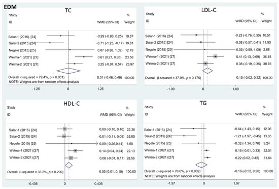 The effects of EDM on TC, LDL-C, HDL-C, and TG. TC = total cholesterol; LDL-C = low-density lipoprotein cholesterol; HDL-C = high-density lipoprotein cholesterol; TG = triglyceride; WMD = weighted mean difference.