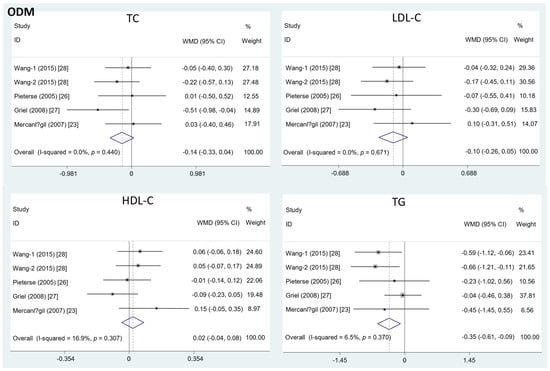 The effects of ODM on TC, LDL-C, HDL-C, and TG.TC = total cholesterol; LDL-C = low-density lipoprotein cholesterol; HDL-C = high-density lipoprotein cholesterol; TG = triglyceride; WMD = weighted mean difference.