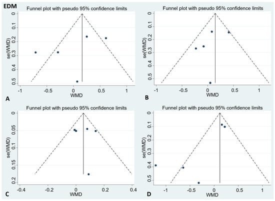 Funnel plots to evaluate publication bias, and the effect of EDM for (A) TC Egger’s test (p = 0.47), (B) LDL-C Egger’s test (p = 0.56), (C) HDL-C Egger’s test (p = 0.96), and (D) TG Egger’s test (p = 0.11). A = TC; B = LDL-C; C = HDL-C; D = TG; TC = total cholesterol; LDL-C = low-density lipoprotein cholesterol; HDL-C = high-density lipoprotein cholesterol; TG = triglyceride.
