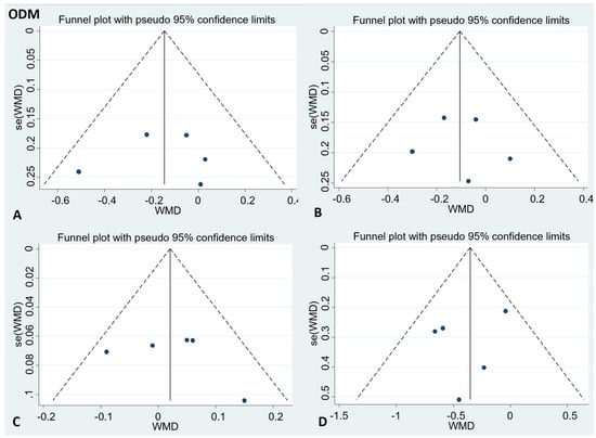 Funnel plots to evaluate publication bias, and the effect of ODM intake for (A) TC Egger’s test (p = 0.89), (B) LDL-C Egger’s test (p = 0.82), (C) HDL-C Egger’s test (p = 0.55), and (D) TG Egger’s test (p = 0.5). A = TC; B = LDL-C; C = HDL-C; D = TG; TC= total cholesterol; LDL-C = low-density lipoprotein cholesterol; HDL-C = high-density lipoprotein cholesterol; TG = triglyceride.