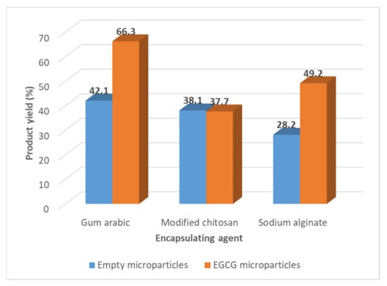 The product yield of the spray drying process, determined by the Equation (1), varied from 28.2 to 42.1% (w/w) for the empty microparticles and between 37.7 and 66.3% for the EGCG microparticles (Figure 1).
