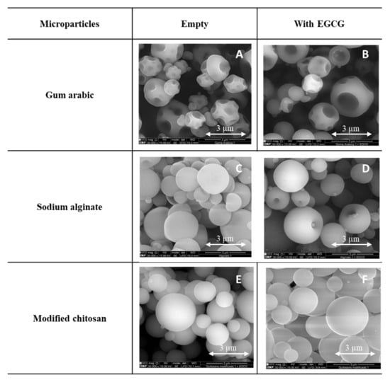 SEM images of the microparticles (empty and with EGCG), prepared with gum arabic (A,B), sodium alginate (C,D) and modified chitosan (E,F). SEM images specifications: magnification: 30,000×, beam intensity (HV): 15.00 kV, distance between the sample and the lens (WD): ±10 mm.