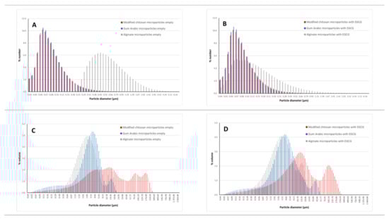 Considering a differential number distribution, the microparticles presented a mean size around 110 nm, except the microparticles were prepared with sodium alginate. The alginate microparticles loaded with EGCG had a mean size around 210 nm and the empty microparticles of sodium alginate of 710 nm. In terms of differential volume distribution, the mean sizes are higher (ranging between 4.22 and 41.55 μm). The empty microparticles prepared with modified chitosan presented the highest value for the mean size (41.55 μm) followed by the EGCG particles prepared with modified chitosan (36.12 μm). The particles prepared with sodium alginate (4.31 (empty)—5.09 μm (EGCG)) and gum arabic (4.22 (empty)—7.22 μm (EGCG)) had smaller mean sizes.