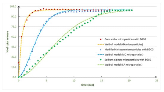 Therefore, relative to the Weibull model, the coefficients of correlation were higher than 0.963 (value that corresponds to the EGCG microparticles prepared with gum arabic). The highest value was for the microparticles prepared with modified chitosan (0.994). According to the literature, the Weibull model is the most adequate model to evaluate the release profiles of matrix-type microparticles, typically produced by spray drying processes, which is the case of the EGCG particles prepared in the present work. Normally, the mechanisms involved on the release from these kind of particles are controlled by solvents action and by diffusion [].