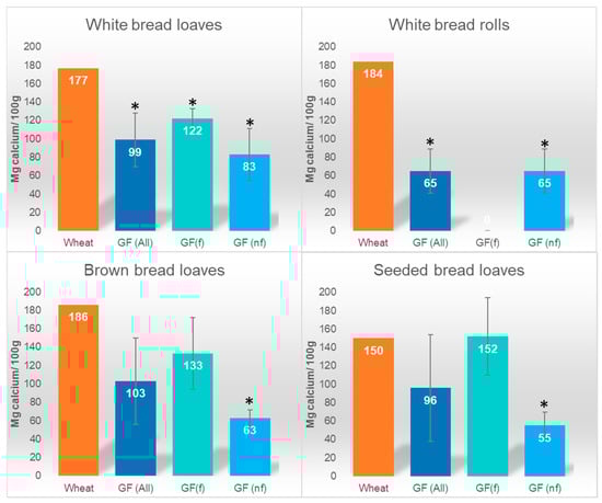 Calcium content of wheat-based and gluten-free (GF) bread products. GF(f): calcium-fortified products, GF(nf): no calcium fortification; calcium fortification category based on information from food label and ingredient list. * p < 0.05 compared with wheat-based bread value.