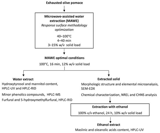 MAWE of bioactive compounds from EOP was studied. The effect of the most important variables (solid loading, temperature, and time extraction) was analyzed using the response surface methodology (RSM). Once these parameters were optimized, the aqueous extract obtained at optimized conditions was further characterized to profile its phenolic compounds and to measure its protein content. The presence of undesirable compounds furfural and hydroxymethylfurfural was also determined. Moreover, the effect of the MAWE conditions on the biomass was evaluated chemically and microscopically for future biorefinery applications. Finally, in order to recover maslinic and oleanolic acids from the extracted EOP solid, a second extraction step was performed using ethanol as the solvent (Figure 1).