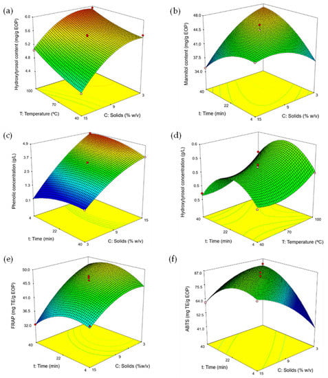 Response surfaces for the Box–Behnken design of: (a) hydroxytyrosol content, (b) mannitol content, (c) phenolic concentration, (d) hydroxytyrosol concentration, (e) FRAP assay, and (f) ABTS assay. In each figure, the third factor was fixed at the intermediate level: 9% solid loading (d), 22 min (a), or 70 °C (b,c,e,f).