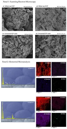 (Panel 1): Scanning electron microscopy images of the milled raw exhausted olive pomace (EOP) (a1,a2) and the extracted EOP solid obtained after microwave-assisted water extraction under optimized conditions (12% w/v, 100 °C, and 16 min) (b1,b2). (Panel 2): Spectrum and elemental maps of carbon, calcium, potassium, and silicon of the milled raw exhausted olive pomace (EOP) (a1–a5) and the extracted EOP solid (b1–b5) obtained by microwave-assisted water extraction at optimal conditions (12% w/v, 100 °C, and 16 min). The images were acquired by scanning electron microscopy–energy dispersive X-ray spectrometry.