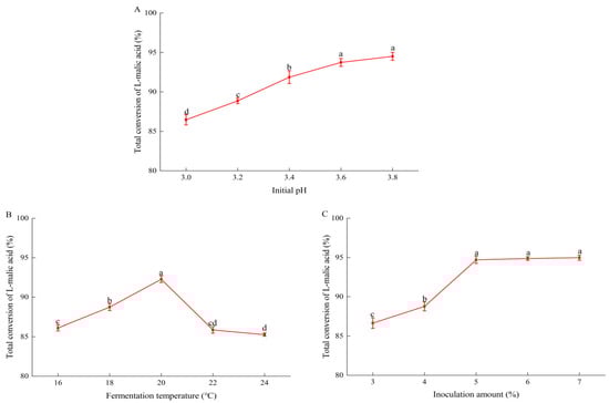 Figure 1. Effects of malolactic fermentation parameters by Oenococcus oeni strain GF-2 on total conversion of l-malic acid in pear–kiwifruit wine: (A) initial pH; (B) malolactic fermentation temperature; (C) amount of O. oeni inoculum. Error bars indicate the SD (n = 3). Values with different letters are significantly different (p < 0.05) among the samples.