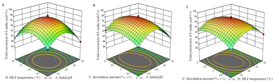 Figure 2. Response surface and contour plots for total conversion of l-malic acid in pear–kiwifruit wine as a function of the independent variables: (A) effect of the initial pH and malolactic fermentation temperature; (B) effect of the initial pH and inoculation amount; (C) effect of the malolactic fermentation temperature and inoculation amount.