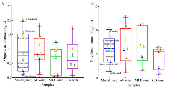 Figure 3. Deacidification modulates organic acid and polyphenol accumulation in pear–kiwifruit wine: (A) organic acid; (B) polyphenol. Mixed juice: pear and kiwifruit juice at the blend ratio of 60:40. AF wine: pear–kiwifruit juice co-inoculated with Saccharomyces cerevisiae ES488 and Metschnikowia. pulcherrima 346. MLF wine: AF wine inoculated with Oenococcus oeni strain GF-2. CD wine: wine chemically deacidified by 1.0 g/L Na2CO3, 1.0 g/L K2CO3, and 5.0 g/L KHC4H4O6. Data are the mean ± SD of three independent experiments. The same symbols with different letters represent significant differences (p < 0.05).