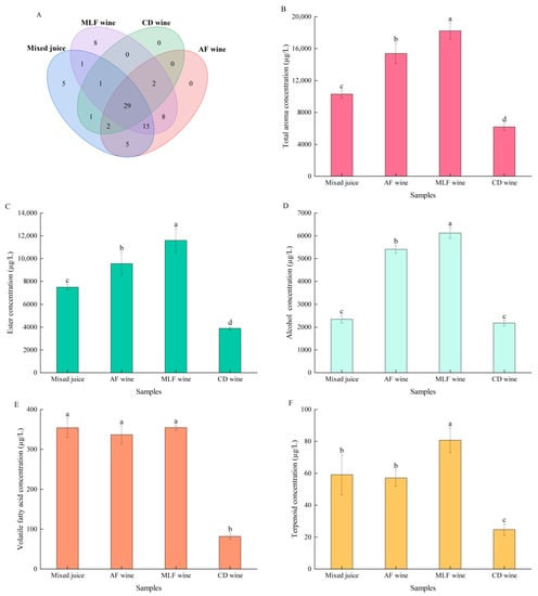 Figure 4. Effects of deacidification treatment on aromatic profile of pear–kiwifruit wine: (A) commonly and uniquely aroma compounds in pear–kiwifruit juice and corresponding wines with and without deacidification treatment; (B) total concentration of aroma compounds; (C) esters; (D) alcohols; (E) volatile fatty acids; (F) terpenoids. Error bars indicate the SD (n = 3). Values with different letters are significantly different (p < 0.05) among the samples.