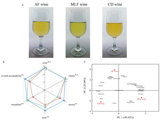 Figure 5. Sensory characteristics of pear–kiwifruit wine with and without deacidification treatment: (A) fruit wine samples; (B) sensory profiles obtained for AF wine (), MLF wine (), and CD wine (); ns = not significant, ** p < 0.01, values with different letters are significantly different among the samples; (C) principal component analysis for check-all-that-apply attributes; n = 36.