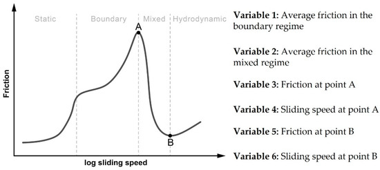 Depiction of a typical Stribeck curve, indicating points A and B for the quantification of variables, and definition of quantified variables [31,32].