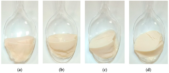 Appearance of the fermented YA, photographed after 12 h storage at 6 °C, removed from the fermentation container. (a) Yoflex control, (b) LcTR116, (c) LpMP070, (d) Lbp6.1.