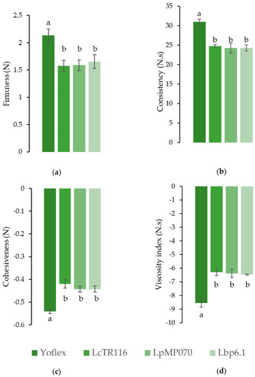 Averages and standard deviations of (a) firmness, (b) consistency, (c) cohesiveness, and (d) viscosity index of the fermented samples as measured by uniaxial compression testing. Values with the same superscript letters are not significantly different (p > 0.05).