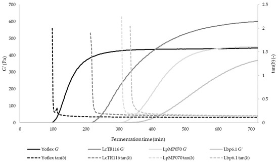 Oscillatory analysis during fermentation in the rheometer gave insight into the different gelation kinetics of the different strains (Figure 4). Gel formation is indicated by a rise of the storage modulus G′, which represents the solid or elastic proportion of a viscoelastic material, while at the same time, the loss modulus G″, which represents the liquid or viscous proportion, decreases. The damping factor tan(δ) is the proportion of G″ to G′. When G′ is larger than G″ and thus tan(δ) < 1, the gelling point is reached, and solid behavior becomes dominant in the material [52]. Gel formation in the Yoflex control was the fastest, starting after 100.7 ± 8.3 min of fermentation time (Table 4). One of the factors influencing acidification rate is fermentation temperature [53], which was higher for Yoflex and therefore explains the faster acidification. In LcTR116, gel formation was reached after 212.8 ± 1.0 min, followed by LpMP070 after 306.1 ± 5.4 min. As both pH values and microbial cell counts at the end of fermentation are similar with both strains, the results of this test indicate a longerlag phase for LpMP070 than for LcTR116. Gelation in Lbp6.1 was the slowest at 328.3 ± 16.5 min, which can be explained by its lower microbial growth compared to the other samples.