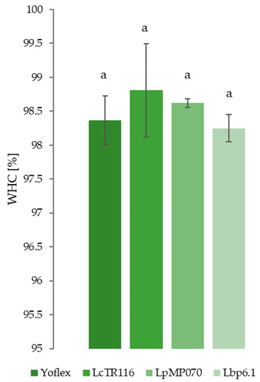 High water holding capacity is a crucial quality attribute of yogurt, as syneresis, i.e., a layer of whey on top of the product due to gel contraction, is undesirable by consumers [55]. Low water holding capacity also means the yogurt is susceptible to whey separation during processing and transport [56]. No statistical difference could be found between water holding capacities between the Yoflex control and the tested strains, and water holding capacity ranged between 98.30% in LpMP070 and 98.62% in Lbp6.1 (Figure 5). A study comparing several commercial plant-based YAs found water holding capacities between 99.3% and 82.8% [8]. This demonstrates that all tested strains can produce a lentil-based YA with water holding properties comparable to products already commercially available.