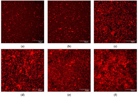 CLSM images of the unfermented and fermented samples. Nile Blue was used to stain the protein, shown in red. (a) unfermented sample with fructose, (b) unfermented sample with sucrose, (c) Yoflex control, (d) LcTR116, (e) LpMP070, (f) Lbp6.1.