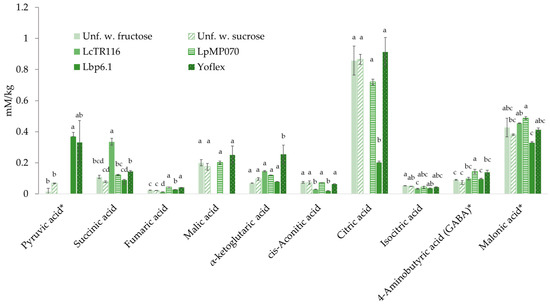 Several metabolites of the tricarboxylic acid cycle in the unfermented and fermented samples as measured by GC-MS. Error bars indicate the standard deviation. Values for each metabolite with the same superscript letters are not significantly different (p > 0.05). * Relative quantification, values are normalized peak areas.