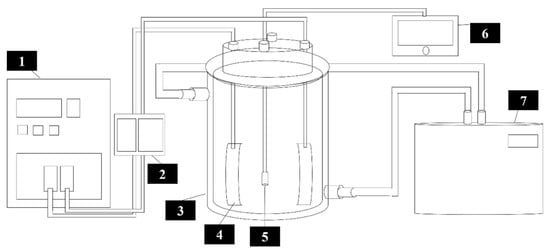 A schematic representation of the ohmic heating extraction-based valorization system designed and developed in the emerging food processing laboratory of the National Pingtung University of Science and Technology. 1: Power supply equipped with online monitoring system. 2: Automatic monitoring and recording device. 3: Extraction chamber. 4: Ohmic electrode. 5: K-type thermocouples. 6: Twelve-channel temperature monitoring system. 7: Temperature regulating system for the conventional heating treatment.