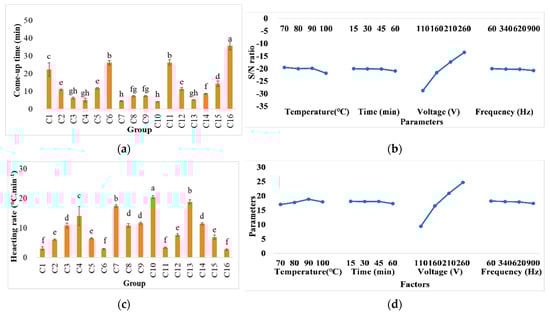 Comparisons of come-up time (a) and response graph of lower-better (b) and heating rate (c), as well as the values with higher-better (d) signal-to-noise ratios of different conditions in ohmic heating treatments. Values C1–C16 represent pineapple cores in different treatment conditions including temperature (°C), time (min), voltage (V), and frequency (Hz), respectively: 1: 70, 15, 110, and 60; 2: 70, 30, 160, and 340; 3: 70, 45, 210, and 620; 4: 70, 60, 260, and 900; 5: 80, 15, 160, and 620; 6: 80, 30, 110, and 900; 7: 80, 45, 260, and 60; 8: 80, 60, 210, and 340; 9: 90, 15, 210, and 900; 10: 90, 30, 260, and 620; 11: 90, 45, 110, and 340; 12: 90, 60, 160, and 60; 13: 100, 15, 260, and 340; 14: 100, 30, 210, and 60; 15: 100, 45, 160, and 900; and 16: 100, 60, 110, and 620. The same letters show insignificant differences in the same rows (p < 0.05). The results are reported as means ± SD.