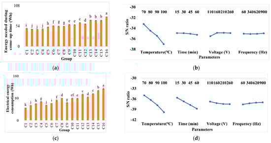 (a) The energy needed during come-up time, (b) response graph, (c) electrical energy consumption, and (d) response graph of the lower-better signal-to-noise ratios of the different conditions in ohmic heating. Values C1–C16 represent pineapple cores in different treatment conditions including temperature (°C), time (min), voltage (V), and frequency (Hz), respectively: 1: 70, 15, 110, and 60; 2: 70, 30, 160, and 340; 3: 70, 45, 210, and 620; 4: 70, 60, 260, and 900; 5: 80, 15, 160, and 620; 6: 80, 30, 110, and 900; 7: 80, 45, 260, and 60; 8: 80, 60, 210, and 340; 9: 90, 15, 210, and 900; 10: 90, 30, 260, and 620; 11: 90, 45, 110, and 340; 12: 90, 60, 160, and 60; 13: 100, 15, 260, and 340; 14: 100, 30, 210, and 60; 15: 100, 45, 160, and 900; and 16: 100, 60, 110, and 620. The same letters show insignificant differences in the same rows (p < 0.05). The results are reported as means ± SD.
