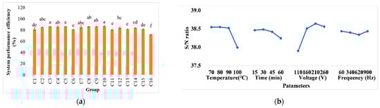 (a) The system performance efficiency, and (b) response graph of higher-better signal-to-noise ratios of various conditions in ohmic heating. Values C1–C16 represent pineapple cores in different treatment conditions including temperature (°C), time (min), voltage (V), and frequency (Hz), respectively: 1: 70, 15, 110, and 60; 2: 70, 30, 160, and 340; 3: 70, 45, 210, and 620; 4: 70, 60, 260, and 900; 5: 80, 15, 160, and 620; 6: 80, 30, 110, and 900; 7: 80, 45, 260, and 60; 8: 80, 60, 210, and 340; 9: 90, 15, 210, and 900; 10: 90, 30, 260, and 620; 11: 90, 45, 110, and 340; 12: 90, 60, 160, and 60; 13: 100, 15, 260, and 340; 14: 100, 30, 210, and 60; 15: 100, 45, 160, and 900; and 16: 100, 60, 110, and 620. The same letters show insignificant differences in the same rows (p < 0.05). The results are reported as means ± SD.