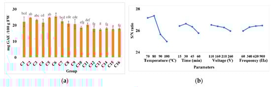 (a) The total phenolic content, and (b) response graph of higher-better signal-to-noise ratio of various conditions in ohmic heating. Values C1–C16 represent pineapple cores in different treatment conditions including temperature (°C), time (min), voltage (V), and frequency (Hz), respectively: 1: 70, 15, 110, and 60; 2: 70, 30, 160, and 340; 3: 70, 45, 210, and 620; 4: 70, 60, 260, and 900; 5: 80, 15, 160, and 620; 6: 80, 30, 110, and 900; 7: 80, 45, 260, and 60; 8: 80, 60, 210, and 340; 9: 90, 15, 210, and 900; 10: 90, 30, 260, and 620; 11: 90, 45, 110, and 340; 12: 90, 60, 160, and 60; 13: 100, 15, 260, and 340; 14: 100, 30, 210, and 60; 15: 100, 45, 160, and 900; and 16: 100, 60, 110, and 620. The same letters show insignificant differences in the same rows (p < 0.05). The results are reported as means ± SD.