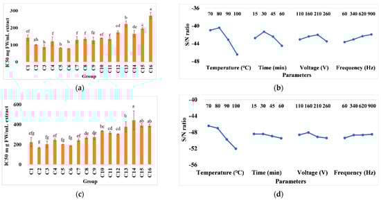 (a) DPPH assay with (b) the response graph of lower-better and (c) the ABTS assay with (d) the response graph of the lower-better signal-to-noise ratios of various conditions in ohmic heating. Values C1−C16 represent pineapple cores in different treatment conditions including temperature (°C), time (min), voltage (V), and frequency (Hz), respectively: 1: 70, 15, 110, and 60; 2: 70, 30, 160, and 340; 3: 70, 45, 210, and 620; 4: 70, 60, 260, and 900; 5: 80, 15, 160, and 620; 6: 80, 30, 110, and 900; 7: 80, 45, 260, and 60; 8: 80, 60, 210, and 340; 9: 90, 15, 210, and 900; 10: 90, 30, 260, and 620; 11: 90, 45, 110, and 340; 12: 90, 60, 160, and 60; 13: 100, 15, 260, and 340; 14: 100, 30, 210, and 60; 15: 100, 45, 160, and 900; and 16: 100, 60, 110, and 620. The same letters show insignificant differences in the same rows (p < 0.05). The results are reported as means ± SD.