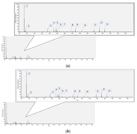Mass spectrometry at a scan range of m/z 100–900 for [M + H]− of the extracts obtained from optimal ohmic (a) and conventional heating (b).