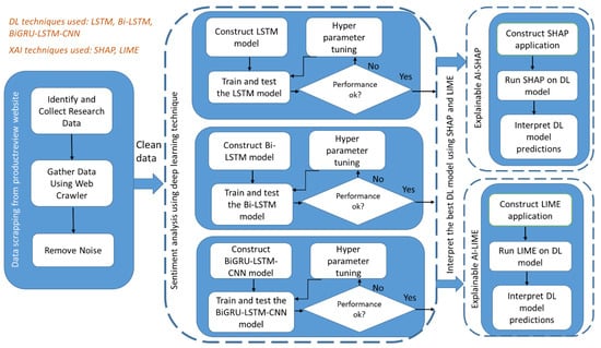 The methodology was designed by keeping the following two goals in mind: (a) perform sentiment analysis using DL models and compare, and (b) explain the predictions by showing the most significant features that contribute to a customer sentiment. The design of the research development methodology that was used to conduct the research presented in this study is shown in Figure 1. The methodology has three major parts–part 1 focused on data scrapping from the ProductReview website; part 2 which focused on developing different DL models (LSTM, Bi-LSTM, Bi-GRU-LSTM-CNN) and assessed the model’s performance; part 3 which focused on explaining the predictions made by the best suitable DL model using XAI techniques (SHAP and LIME).