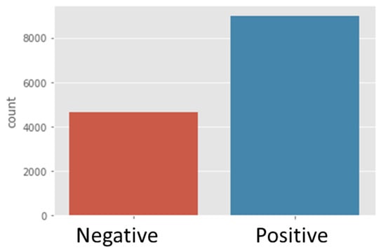 The dataset was grouped into the following binary sentiment tasks: positive and negative classes. The positive class was labelled as ratings of 4 and above, and the negative class was labelled as a rating of 2 or below. The dataset was then divided into 8995 positive reviews and 4626 negative reviews (Figure 2). Rating 3 was not placed in any of the classes.