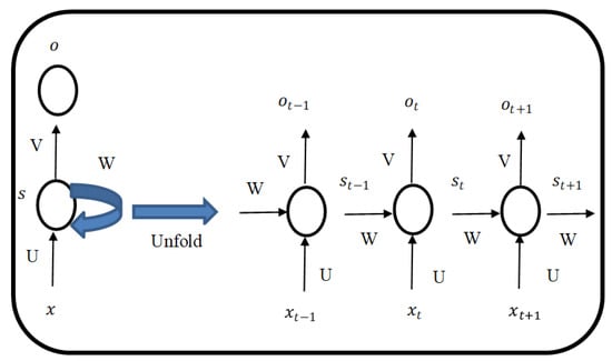 A sequence of data input works well with an RNN []. In traditional neural networks, all the input variables are independent of the output variable. Some of the NLP problem examples, such as predicting if the sentence is positive or negative, spam classifier or time-series data, stock forecasting or sales forecasting, can be solved by RNN []. Bag of words, term frequency-inverse document frequency and Word2VEC are used for text preprocessing which convert text into vectors to solve NLP problems in machine learning. The issue with these algorithms is that they discard the sequence information in the sentence, thereby resulting in lower accuracy. The name “RNN” refers to the fact that each element in the sequence is subject to the same task, with the output being based on earlier calculations. It is expected that RNNs have memory, whereby they will keep track of data from earlier steps. However, in actual practise, they can only retrace a few steps []. Figure 3 shows a typical RNN architecture with respect to time-series data.