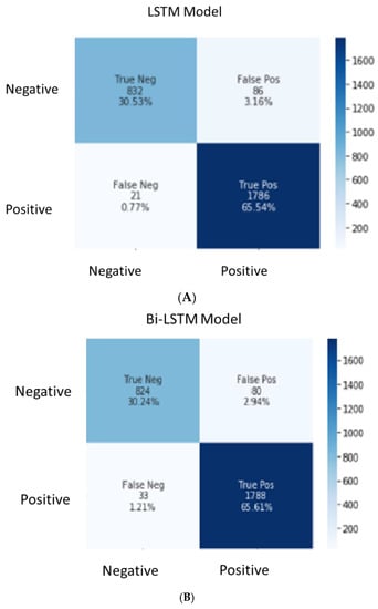 Similarly, the confusion matrix (Figure 5B) shows that the Bi-LSTM classifier can perform accurate prediction (65.61% reviews, which are positive, and 30.24% reviews, which are negative), resulting in a 95.85 percent overall accuracy. The Bi-LSTM classifier returns 1.21% false negative results, and 2.94% false-positive results. The numbers from the confusion matrix were validated with the performance metrics (Table 2) by using the assessment measures.