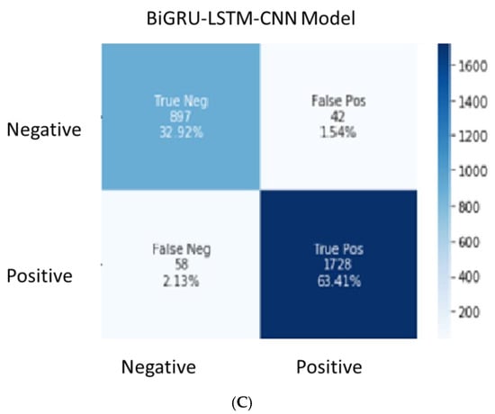 The confusion matrix (Figure 5C) shows that the Bi-GRU-LSTM-CNN classifier can perform accurate prediction (63.41% reviews, which are positive, and 32.92%, reviews which are negative), resulting in a 96.33% overall accuracy. The Bi-GRU-LSTM-CNN classifier leads to 2.13% false negative results, and 1.54% false-positive results. The numbers from the confusion matrix were validated with the performance metrics (Table 2) by using the assessment measures.