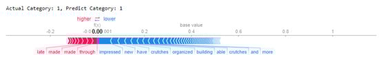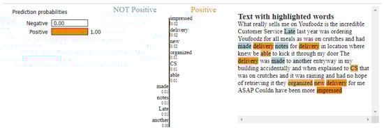 Figure 6 represents the SHAP explanation for the LSTM model’s detection of a positive customer review. The force plot and customer review suggest that the customer was very happy with the customer service received following their new delivery of the meal after requesting redelivery because the customer was on crutches. The words represented in blue contribute to positive sentiment, and the words shown in red contribute to negative sentiment. The explainable model demonstrated that words, such as ‘impressed’, ‘new’ and ‘have’, strongly pushed the output prediction value toward positive sentiment, which matches with the actual positive customer review prediction.