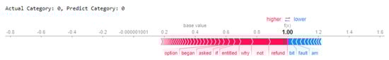 Figure 7 shows the SHAP explanation for negative customer review prediction. The inference from the force plot and customer review is that the customer is asking for a refund because the ordered subway came without salad and sauce. The words, such as ‘refund’, ‘not’, ’why’ and ‘entitled’, show a positive correlation with the negative customer review prediction.