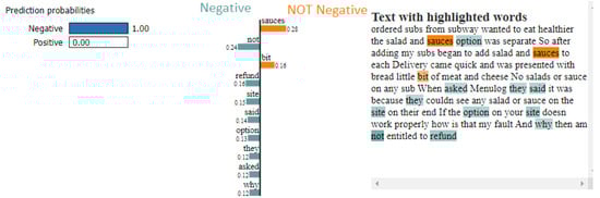 In the next example of customer review 2, the LSTM model was 100% certain that the customer review (shown in Figure 9) indicated negative sentiment. LIME explainer suggests that the words, such as ‘not’, ‘refund’ and ‘site’, show a positive correlation with the negative customer review prediction.