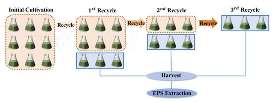 To ensure the volume of each cycle was consistent, A. platensis required for the three-cycle culture was prepared in the initial culture. The culture time, 10 days, was used in our study because it mimics the real-world A. platensis cultivation process in local plants and the maximum EPS production of A. platensis was obtained. The experimental design is shown in Figure 1. The details of the culture conditions are described in Section 2.1.