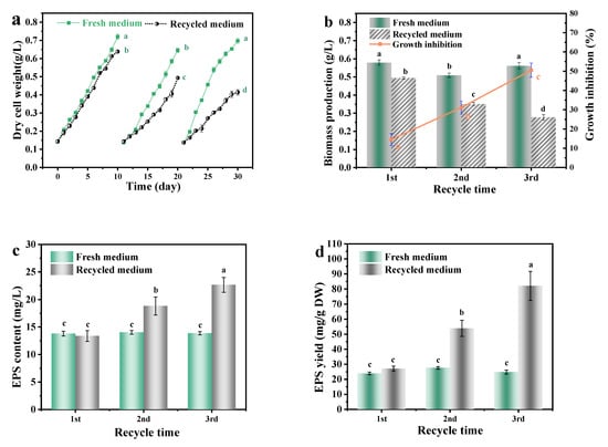The effects of medium recycling on the growth and EPS secretion of A. platensis: (a) Growth curves; (b) Biomass production and growth inhibition; (c) EPS content; (d) EPS yield; DW: dry weight; a–d: Different letters above the bars indicated a significant difference among the groups. Points showed average of three independent measurements; vertical bars indicated the standard deviation. (p < 0.01, n = 3).
