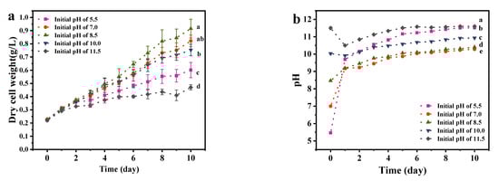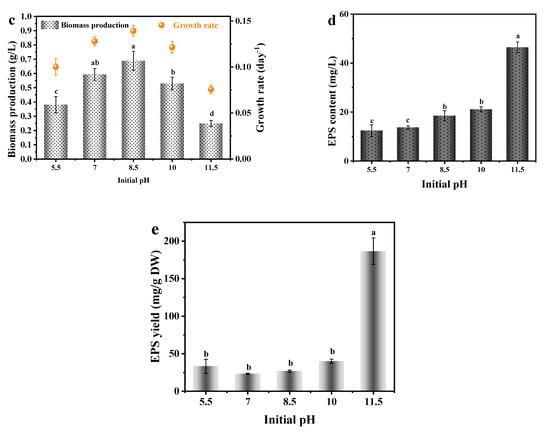 As can be observed from Figure 3e, the EPS yield of A. platensis cultured at an initial pH of 11.5 was the highest, up to 92.87 mg/g DW, which was 2.52 times that in the optimal growth condition (initial pH of 8.5). Normally, the EPS secretion of microalgae was a self-protection mechanism that against adverse environments []. Under a strong alkaline environment (medium initial pH of 11.5), the supply of carbon source in the culture medium is sufficient, but the availability and metabolism of nitrogen may be inhibited.