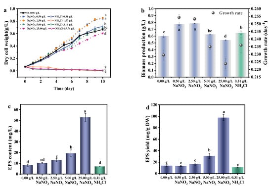 The effects of nitrogen source and concentration on the growth and EPS secretion of A. platensis: (a) Growth curves; (b) Biomass production and growth rate; (c) EPS content; (d) EPS yield; DW: dry weight; a–e: Different letters above the bars indicated a significant difference among the groups. Points showed average of three independent measurements; vertical bars indicated the standard deviation. (p < 0.01, n = 3).