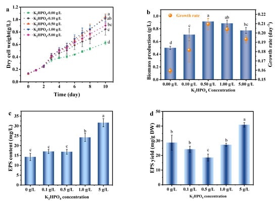 The effects of phosphate concentration on the growth and EPS secretion of A. platensis: (a) Growth curves; (b) Biomass production and growth rate; (c) EPS content; (d) EPS yield; DW: dry weight; a–d: Different letters above the bars indicated a significant difference among the groups. Points showed average of three independent measurements; vertical bars indicated the standard deviation. (p < 0.01, n = 3).