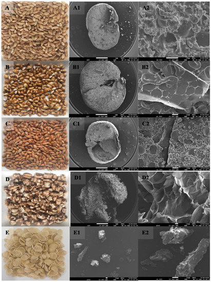 SEM of highland barley after processing by different thermal treatments. (A): Untreated (CK); (B): Sand-roasting (SR); (C): Far-infrared Baking (FB); (D): Steam Explosion (SE); (E): Extrusion (EX).