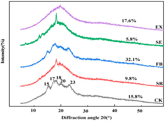 X-ray patterns of whole grain highland barley flour with different thermal treatments. CK: untreatment; SR: Sand-roasting; FB: Far-infraredBaking; SE: Steam Explosion; EX: Extrusion.