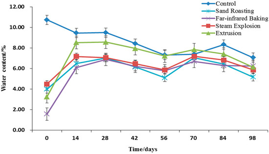 With the extension of storage time, the whole grain HB flour absorbed the water in the environment, and the moisture content gradually increased (Figure 3). After 14 days of storage, the moisture content of whole grain HB flour tended to balance. Grain is a porous colloidal material, with a strong ability to adsorb gas and vapor. In this study, under certain conditions of ambient temperature and humidity, when the water vapor pressure inside and outside the grain or flour was equal, the moisture absorption and moisture dissipation of the sample were in dynamic equilibrium. During the storage period determined by the test, the whole grain HB flour treated by extrusion exhibited a strong ability to adsorb water in the environment, and the ability of the whole grain HB flour after other cooking treatments to adsorb water in the environment was similar, without significant difference (p ≤ 0.05). The moisture content of extruded whole grain HB flour reached about 8% on the 14th day. With the extension of storage time, the moisture content of the control gradually decreased. After 56 days of storage, the moisture content tended to balance, and stabilized at about 7%.