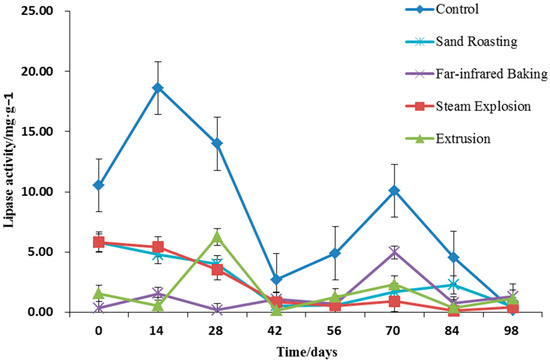 Improving the storage stability is typically achieved by destroying enzymes or inhibiting enzyme activity. Thermal treatment will effectively reduce lipase activity and enhance grain storage stability. Previous reports have indicated that microwave, hot steam, dry heat, infrared, extrusion, and other thermal treatments exert a good effect on grain lipase inactivation [44]. Figure 4 indicates that the untreated whole grain HB flour had high lipase activity. The lipase activity of whole grain HB flour after different thermal treatments was significantly reduced by 5% (p < 0.05), all maintained below 5 mg g−1. With the increase of storage time, the lipase activity increased accordingly. The lipase activity of whole grain HB flour treated by extrusion and steam explosion remained high in the first 28 days of storage, then decreased. There was no significant difference among the other treatments, and the lipase activity remained at a low level the entire time. This was consistent with the change trend of moisture content during storage. The water reabsorption of whole grain HB flour reduced the inhibition and improved the lipase activity. The moisture content of whole grain HB flour was kept at a low level of 7% during storage (Figure 3), thereby effectively inhibiting the lipase activity and keeping the lipase activity of cooked whole grain HB flour at a low level during the entire storage period.